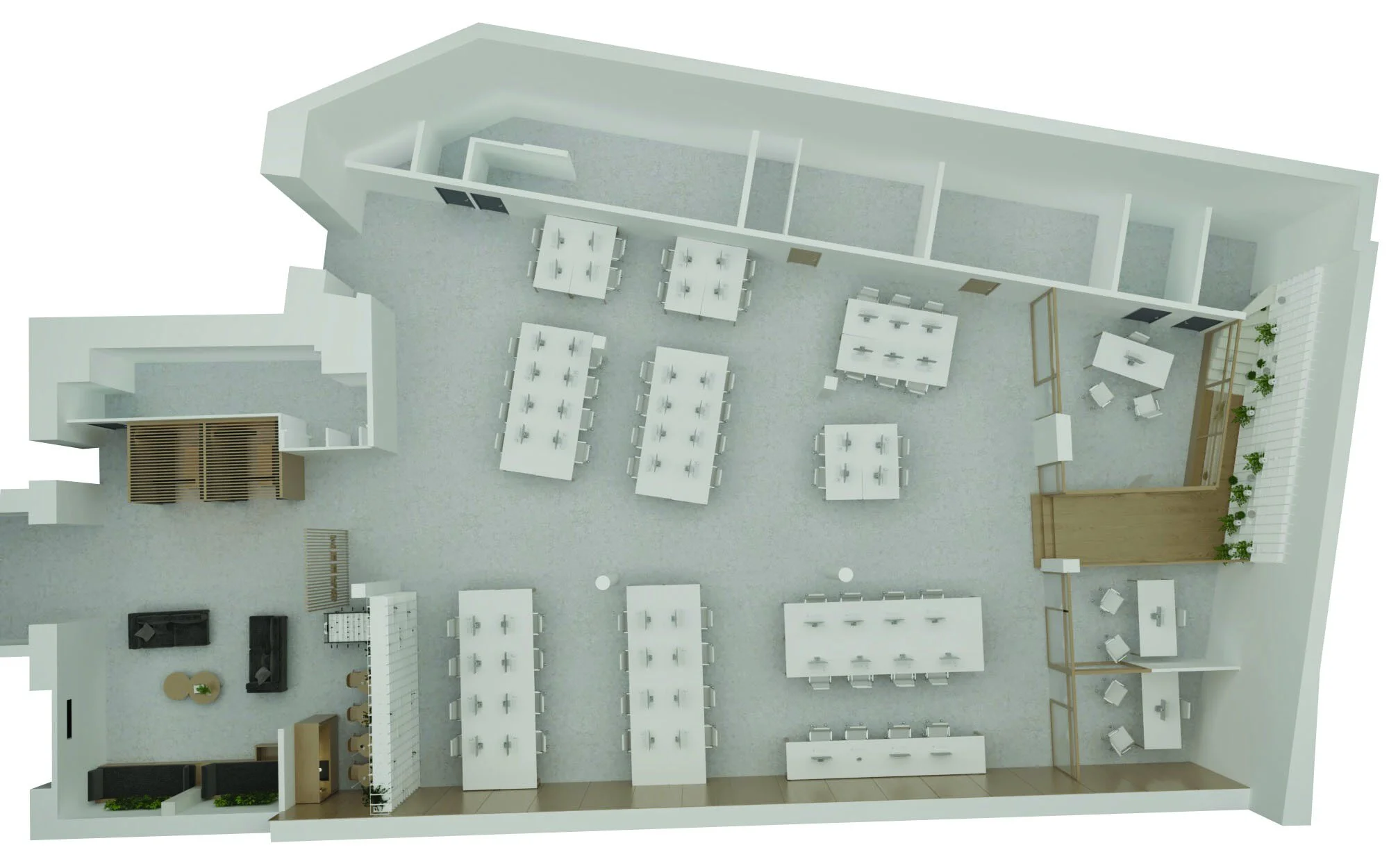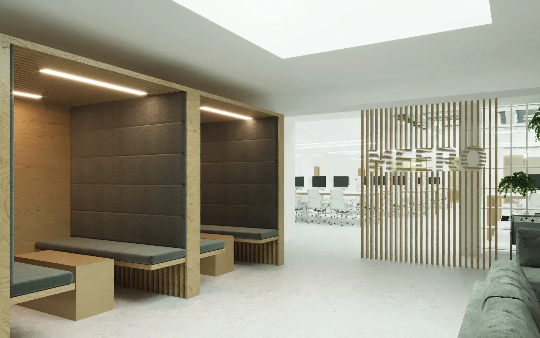 Proposition d’aménagement de bureau - space-planning. En pleine phase de croissance à courbe exponentielle, la start-up française MEERO nous a consulté pour aménager de nouveaux bureaux dans un local nu de 600m2 . Des espaces de détentes, de restauration, des travails se distillent alors au sein d’un environnement lumineux et chaleureux, grâce à un thème constructif à base de matériaux noble comme le bois, le béton, le verre, et une végétation omniprésente.